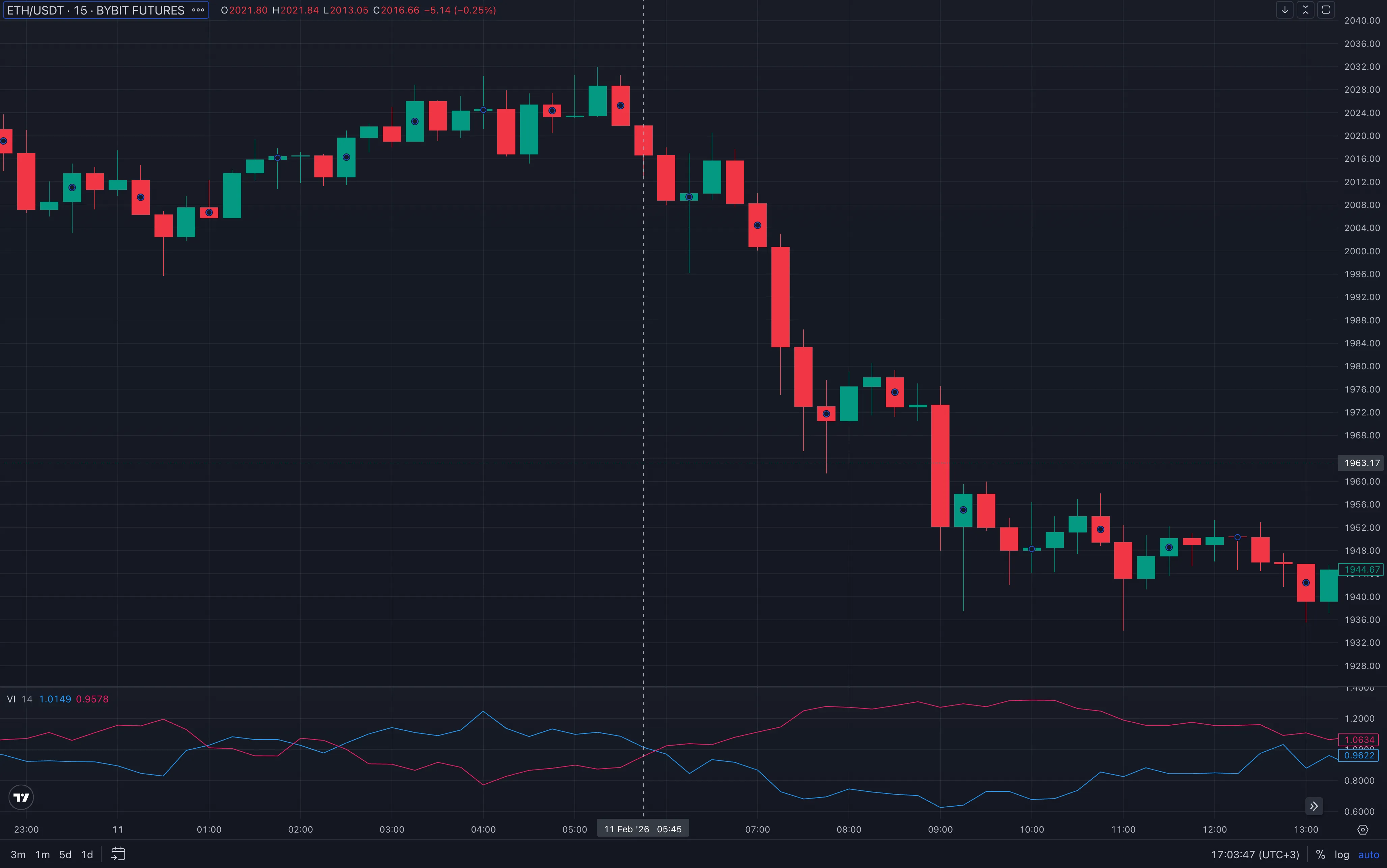 On the Veles platform, the standard Vortex indicator from the TradingView library is used. The indicator period is fixed at 14.